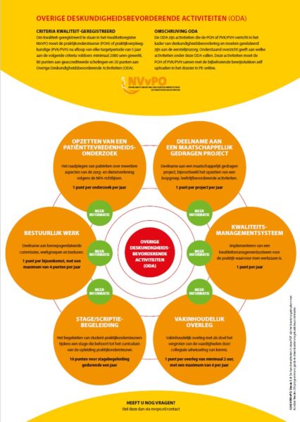 In deze infografic vind je inspirerende voorbeelden van activiteiten waarmee je ODA-punten kunt behalen, én wat je nodig hebt om deze in te dienen binnen je kwaliteitsregister. Dit zijn voorbeelden ter inspiratie. Je mag ook zelf activiteiten aandragen en indienen. De registratiecommissie beoordeelt vervolgens hoeveel punten je daarvoor ontvangt.